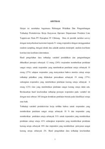 Skripsi ini membahas bagaimana Hubungan Pelatihan Dan Pengembangan Terhadap Produktivitas Kerja Karyawan Operator Departemen Produksi Line Tupperware Pada PT Dynaplast IV Cibitung. Data di peroleh melalui survey dengan menyebarkan kuesioner kepada 51 orang responden dengan menggunakan random sampling, dengan teknik data adalah analisis deskriptif, analisis koefisien korelasi dan koefisien determinan. Hasil pengolahan data terhadap variabel pendidikan dan pengembangan dihasilkan persepsi sebanyak 12 orang (24%) responden memberikan penilaian sangat setuju, untuk responden yang memberikan penilaian setuju sebanyak 14 orang (27%) adapun responden yang menyatakan bahwa mereka cukup setuju terhadap pelatihan yang dilakukan perusahaan sebanyak 19 orang (37%) sedangkan responden yang memberikan penilaian kurang setuju sebanyak 6 orang (12%) dan yang memberikan penilaian sangat kurang setuju tidak ada. Berdasarkan hasil keseluruhan terhadap persepsi responden pada variabel ini dengan niai sebesar 185 dengan demikian penilaian berada pada klasifikasi setuju atau baik. Terhadap variabel produktivitas kerja terlihat bahwa untuk responden yang memberikan penilaian sangat setuju sebanyak 18 % dan responden yang memberikan penilaian setuju sebanyak 31% untuk repsonden yang memberikan penilaian cukup setuju 41% sedangkan responden yang memberikan penilaian kurang setuju sebanyak 10% dan responden yang memberikan pernyatan sangat kurang setuju sebanyak 2%. Hasil pengolahan data terhadap keseluruhan ii tanggapan responden dengan nilai sebesar 181 dengan demikian nilai rata-rata berada pada klasifikasi setuju atau baik. Hasil pengolahan data dengan menggunakan uji korelasi rangkspermen dihasilkan nilai sebesar 0.403 (40,3%) dengan demikian ada hubungan positif relative positive lemah antara variabel menurut Sugiono tahun 2009 halaman 314, dimana nilai koefisien determinan sebesar 0.162 (16.2%) dengan demikian variasi peningkatan atau penurunan variabel produktivitas kerja dapat dijelaskan oleh variabel pelatihan pengembangan, hasil uji hipotesis terlihat bahwa zhitung 2.849 > ztabel 1,96, sehingga kriteria yang dipakai adalah tolak Ho yaitu adanya hubungan antara pelatihan pengembangan terhadap produktivitas, sehingga variabel pelatihan dan pengembangan dapat dijadikan parameter untuk menentukan produktivitas kerja karyawan operator Departemen Produksi Line Tupperware Pada PT Dynaplast IV Cibitung.