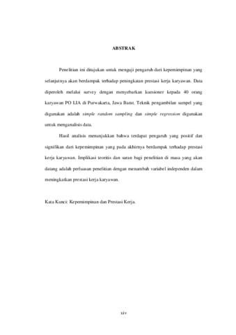 Penelitian ini ditujukan untuk menguji pengaruh dari kepemimpinan yang selanjutnya akan berdampak terhadap peningkatan prestasi kerja karyawan. Data diperoleh melalui survey dengan menyebarkan kuesioner kepada 40 orang karyawan PO LIA di Purwakarta, Jawa Barat. Teknik pengambilan sampel yang digunakan adalah simple random sampling dan simple regression digunakan untuk menganalisis data. Hasil analisis menunjukkan bahwa terdapat pengaruh yang positif dan signifikan dari kepemimpinan yang pada akhirnya berdampak terhadap prestasi kerja karyawan. Implikasi teoritis dan saran bagi penelitian di masa yang akan datang adalah perluasan penelitian dengan menambah variabel independen dalam meningkatkan prestasi kerja karyawan.