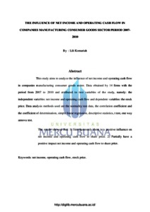 This study aims to analyze the influence of net income and operating cash flow in companies manufacturing consumer goods sector. Data obtained by 14 firms with the period from 2007 to 2010 and attributed to two variables of the study, namely: the independent variables: net income and operating cash flow and dependent variables: the stock price. Data analysis methods used are the normality test data, the correlation coefficient and the coefficient of determination, simple linear regression, descriptive statistics, t test, one way annova test. The results showed that: 1) Simultaneously there is a positive influence on net income and operating cash flow to share price. 2) Partially have a positive impact net income and operating cash flow to share price.