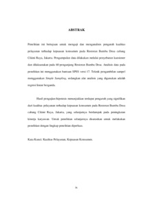 Penelitian ini bertujuan untuk menguji dan menganalisis pengaruh kualitas pelayanan terhadap kepuasan konsumen pada Restoran Bumbu Desa cabang Cikini Raya, Jakarta. Pengumpulan data dilakukan melalui penyebaran kuesioner dan dilaksanakan pada 60 pengunjung Restoran Bumbu Desa. Analisis data pada penelitian ini menggunakan bantuan SPSS versi 17. Teknik pengambilan sampel menggunakan Simple Sampling, sedangkan alat analisis yang digunakan adalah regresi linear berganda. Hasil pengujian hipotesis menunjukkan terdapat pengaruh yang signifikan dari kualitas pelayanan terhadap kepuasan konsumen pada Restoran Bumbu Desa cabang Cikini Raya, Jakarta, yang selanjutnya berdampak pada peningkatan kinerja karyawan. Untuk penelitian selanjutnya disarankan untuk melakukan penelitian dengan lingkup penelitian diperluas.