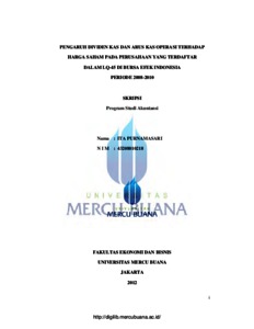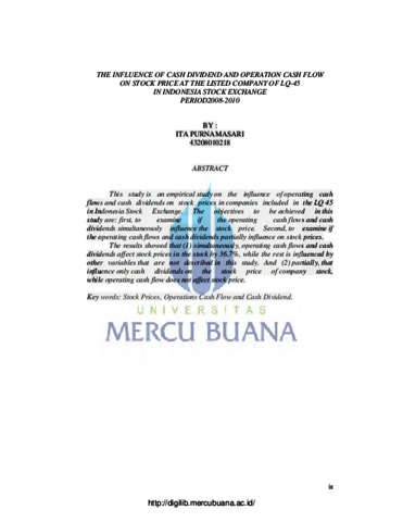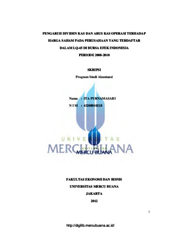 PURNAMASARI, ITA (2012) PENGARUH DIVIDEN KAS DAN ARUS KAS OPERASI TERHADAP HARGA SAHAM PADA PERUSAHAAN YANG TERDAFTAR DALAM LQ-45 DI BURSA EFEK INDONESIA PERIODE 2008-2010. S1 thesis, Universitas Mercu Buana Jakarta.