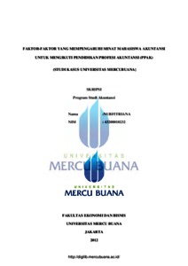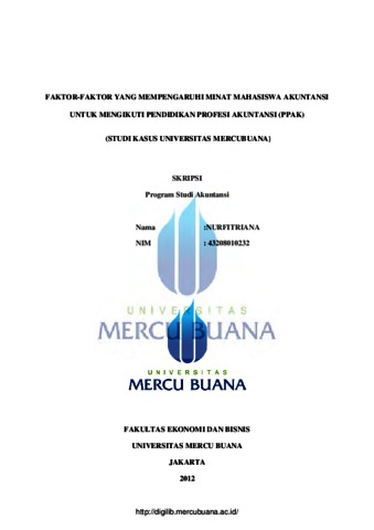 NURFITRIANA, NURFITRIANA (2012) FAKTOR-FAKTOR YANG MEMPENGARUHI MINAT MAHASISWA AKUNTANSI UNTUK MENGIKUTI PENDIDIKAN PROFESI AKUNTANSI (PPAK) (STUDI KASUS UNIVERSITAS MERCUBUANA). S1 thesis, Universitas Mercu Buana Jakarta.