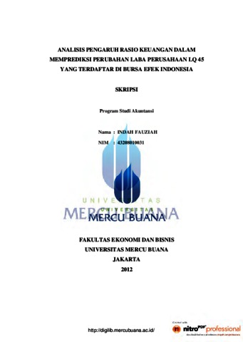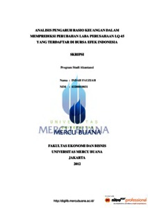 FAUZIAH, INDAH (2012) ANALISIS PENGARUH RASIO KEUANGAN DALAM MEMPREDIKSI PERUBAHAN LABA PERUSAHAAN LQ 45 YANG TERDAFTAR DI BURSA EFEK INDONESIA. S1 thesis, Universitas Mercu Buana Jakarta.