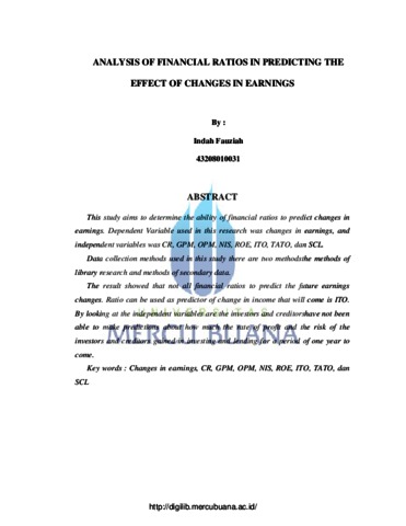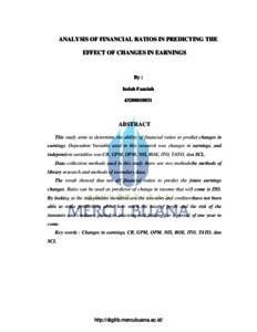 Penelitian ini bertujuan untuk mengetahui kemampuan rasio keuangan dalam memprediksi perubahan laba. Variabel dependen yang digunakan adalah perubahan laba dan variabel independennya adalah CR, GPM, OPM, NIS, ROE, ITO, TATO, dan SCL. Metode pengumpulan data yang digunakan dalam penelitian ini ada dua metode yaitu metode penelitian kepustakaan dan metode data sekunder. Hasil penelitian menunjukkan bahwa tidak semua rasio keuangan mampu memprediksi perubahan laba yang akan datang. Rasio yang dapat digunakan sebagai predictor perubahan laba yang akan datang adalah ITO. Dengan melihat variabel independen tersebut para investor dan kreditor belum dapat melakukan prediksi mengenai seberapa besar tingkat laba dan resiko yang diperoleh investor dan kreditor dalam berinvestasi dan pemberian kredit untuk jangka waktu satu tahun yang akan datang.