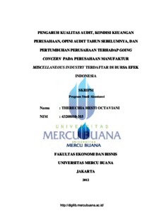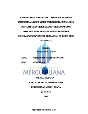 OCTAVIANI, THERECHIA HESTI (2012) PENGARUH KUALITAS AUDIT, KONDISI KEUANGAN PERUSAHAAN, OPINI AUDIT TAHUN SEBELUMNYA, DAN PERTUMBUHAN PERUSAHAAN TERHADAP GOING CONCERN PADA PERUSAHAAN MANUFAKTUR MISCELLANEOUS INDUSTRY TERDAFTAR DI BURSA EFEK INDONESIA. S1 thesis, Universitas Mercu Buana Jakarta.