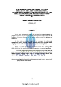 le society. For us, the auditors report can be guidance to know and trus the condition of company financial. So, the opinion auditors should be right and can be trusted. In this study, we attempt empirically to investigate the relationship between audit quality, financial condition, previous audit report and sales growth on going concern audit opinion would receive a going concern opinion. There is a sample of companies listed at Indonesia Stock Exchange from 2008 – 2009. And this research used Logistic regression to examine hypothesis. The results indicate that previous audit report are significantly affect the going concern audit opinion. On the other hand, audit quality, financial condition (Altman Z-Score) and sales growth does not have effect on going concern audit opinion.