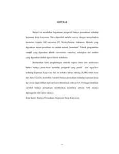 Skripsi ini membahas bagaimana pengaruh budaya perusahaan terhadap kepuasan kerja karyawan. Data diperoleh melalui survey dengan menyebarkan kuesioner kepada 100 karyawan PT WorleyParsons Indonesia. Metode yang digunakan dalam penelitian ini adalah metode kuantitatif. Teknik pengambilan sampel yang digunakan adalah convenience sampling, sedangkan alat analisis yang digunakan adalah regresi linear sederhana. Berdasarkan hasil penghitungan statistik regresi linier dan analisisnya bahwa budaya perusahaan memiliki pengaruh yang positif dan signifikan terhadap kepuasan karyawan, hal ini terbukti bahwa thitung (8,449) lebih besar dari ttabel (2,626), kontribusi variabel budaya perusahaan terhadap kepuasan kerja karyawan dapat dilihat dari koefisien determinasi sebesar 0,4 21 dengan demikian variabel budaya perusahaan memberikan kontribusi sebesar 42% sisanya dipengaruhi oleh faktor lainnya.