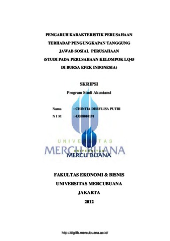 PUTRI, CHINTIA DERYLISA (2012) PENGARUH KARAKTERISTIK PERUSAHAAN TERHADAP PENGUNGKAPAN TANGGUNGJAWAB SOSIAL PERUSAHAAN(STUDI PADA PERUSAHAAN KELOMPOK LQ45 DI BURSA EFEK INDONESIA). S1 thesis, Universitas Mercu Buana Jakarta.