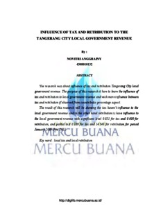 The research was about influence of tax and retribution Tangerang City local government revenue. The purpose of this research it how to know the influence of tax and retribution to local government revenue and wich more influence between tax and retribution if observed from countributio percentage aspect. The result of this research will be showing the tax haven’t influence to the local government revenue and in the other hand retribution is have influence to the local government revenue with significant level 0.851 for tax and 0.000 for retribution, and partial test 0.189 for tax and 14.543 for retribution for period January 2009-Juni 2011.