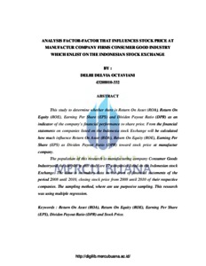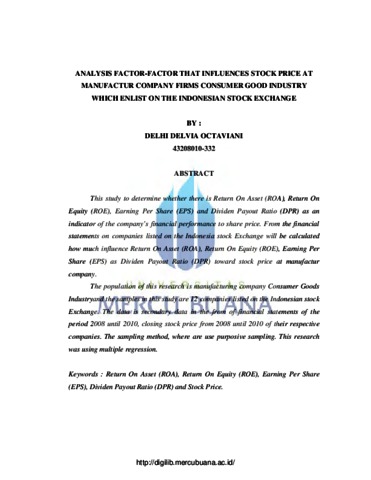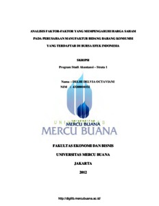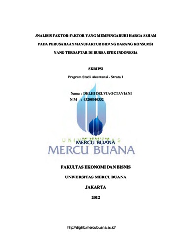 OCTAVIANI, DELHI DELVIA (2012) ANALISIS FAKTOR-FAKTOR YANG MEMPENGARUHI HARGA SAHAM PADA PERUSAHAAN MANUFAKTUR BIDANG BARANG KONSUMSI YANG TERDAFTAR DI BURSA EFEK INDONESIA. S1 thesis, Universitas Mercu Buana Jakarta.