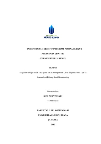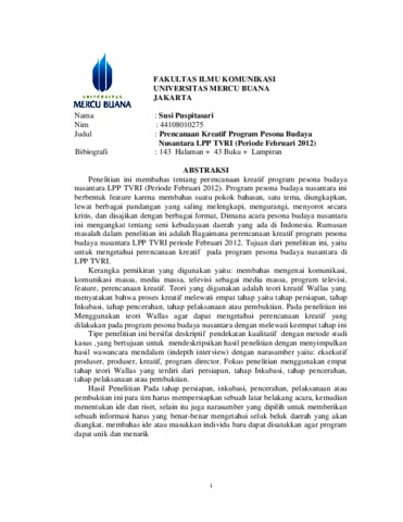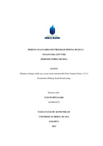 PUSPITASARI, SUSI (2012) PERENCANAAN KREATIF PROGRAM PESONA BUDAYA NUSANTARA LPP TVRI (PERIODE FEBRUARI 2012). S1 thesis, Universitas Mercu Buana Jakarta.