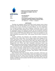 Penelitian ini membahas tentang perencanaan kreatif program pesona budaya nusantara LPP TVRI (Periode Februari 2012). Program pesona budaya nusantara ini berbentuk feature karena membahas suatu pokok bahasan, satu tema, diungkapkan, lewat berbagai pandangan yang saling melengkapi, mengurangi, menyorot secara kritis, dan disajikan dengan berbagai format, Dimana acara pesona budaya nusantara ini mengangkat tentang seni kebudayaan daerah yang ada di Indonesia. Rumusan masalah dalam penelitian ini adalah Bagaimana perencanaan kreatif program pesona budaya nusantara LPP TVRI periode Februari 2012. Tujuan dari penelitian ini, yaitu untuk mengetahui perencanaan kreatif pada program pesona budaya nusantara di LPP TVRI. Kerangka pemikiran yang digunakan yaitu: membahas mengenai komunikasi, komunikasi massa, media massa, televisi sebagai media massa, program televisi, feature, perencanaan kreatif. Teori yang digunakan adalah teori kreatif Wallas yang menyatakan bahwa proses kreatif melewati empat tahap yaitu tahap persiapan, tahap Inkubasi, tahap pencerahan, tahap pelaksanaan atau pembuktian. Pada penelitian ini Menggunakan teori Wallas agar dapat mengetahui perencanaan kreatif yang dilakukan pada program pesona budaya nusantara dengan melewati keempat tahap ini Tipe penelitian ini bersifat deskriptif pendekatan kualitatif dengan metode studi kasus ,yang bertujuan untuk mendeskripsikan hasil penelitian dengan menyimpulkan hasil wawancara mendalam (indepth interview) dengan narasumber yaitu: eksekutif produser, produser, kreatif, program director. Fokus penelitian menggunakan empat tahap teori Wallas yang terdiri dari persiapan, tahap Inkubasi, tahap pencerahan, tahap pelaksanaan atau pembuktian. Hasil Penelitian Pada tahap persiapan, inkubasi, pencerahan, pelaksanaan atau pembuktian ini para tim harus mempersiapkan sebuah latar belakang acara, kemudian menentukan ide dan riset, selain itu juga narasumber yang dipilih untuk memberikan sebuah informasi harus yang benar-benar mengetahui seluk beluk daerah yang akan diangkat. membahas ide atau masukkan individu baru dapat disatukkan agar program dapat unik dan menarik