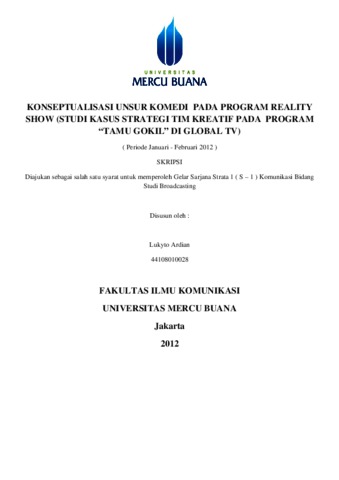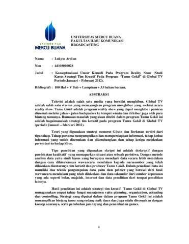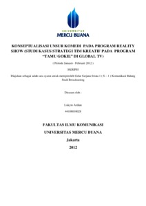 ARDIAN, LUKYTO (2012) KONSEPTUALISASI UNSUR KOMEDI PADA PROGRAM REALITY SHOW (STUDI KASUS STRATEGI TIM KREATIF PADA PROGRAM “TAMU GOKIL” DI GLOBAL TV) ( Periode Januari - Februari 2012 ). S1 thesis, Universitas Mercu Buana Jakarta.