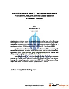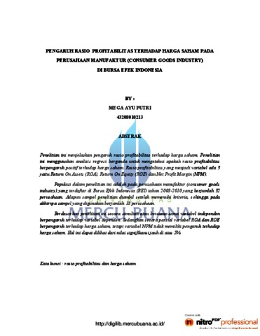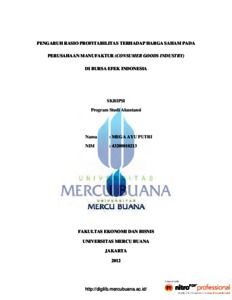PUTRI, MEGA AYU (2012) PENGARUH RASIO PROFITABILITAS TERHADAP HARGA SAHAM PADA PERUSAHAAN MANUFAKTUR (CONSUMER GOODS INDUSTRY) DI BURSA EFEK INDONESIA. S1 thesis, Universitas Mercu Buana Jakarta.