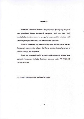 Pemberian kompensasi memiliki arti yang sangat penting bagi karyawan dan perusahaan, karena kompensasi merupakan salah satu cara untuk meningkatkan komitmen karyawan sehingga karyawan memiliki keinginan untuk tetap bergabung dan mendukung semua kebijasanaan perusahaan. Selain itu kompensasi juga penting bagi karyawan individu karena besarnya kompensasi mencerminkan ukuran nilai karya mereka diantara karyawan itu sendiri, keluarga, dan masyarakat. Untuk itu, pada penelitian ini bertujuan untuk mengetahui seberapa besar pengaruh kompensasi terhadap komitmen karyawan pada PT INDOLIFE PENSIONTAMA