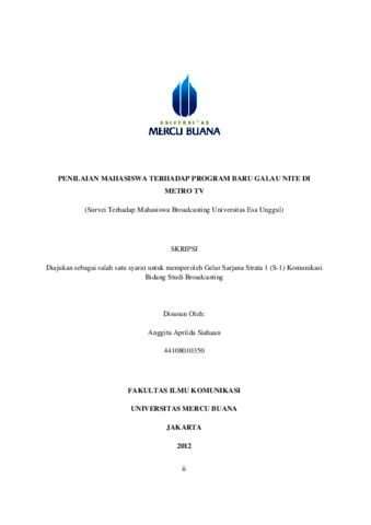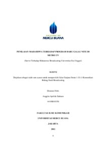 SIAHAAN, ANGGITA APRILDA (2012) PENILAIAN MAHASISWA TERHADAP PROGRAM BARU GALAU NITE DI METRO TV (Survei Terhadap Mahasiswa Broadcasting Universitas Esa Unggul). S1 thesis, Universitas Mercu Buana Jakarta.