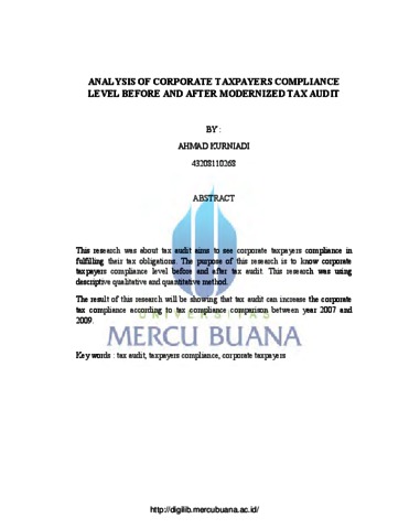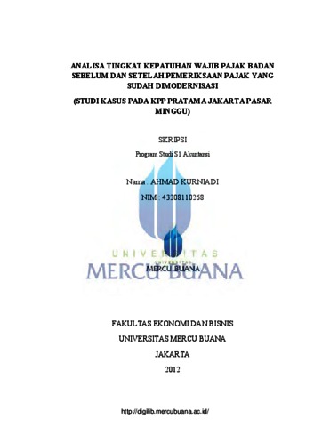 KURNIADI, AHMAD (2012) ANALISA TINGKAT KEPATUHAN WAJIB PAJAK BADAN SEBELUM DAN SETELAH PEMERIKSAAN PAJAK YANG SUDAH DIMODERNISASI (STUDI KASUS PADA KPP PRATAMA JAKARTA PASAR MINGGU). S1 thesis, Universitas Mercu Buana Jakarta.