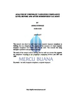 This research was about tax audit aims to see corporate taxpayers compliance in fulfilling their tax obligations. The purpose of this research is to know corporate taxpayers compliance level before and after tax audit. This research was using descriptive qualitative and quantitative method. The result of this research will be showing that tax audit can increase the corporate tax compliance according to tax compliance comparison between year 2007 and 2009.