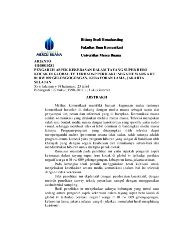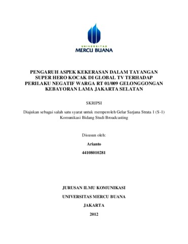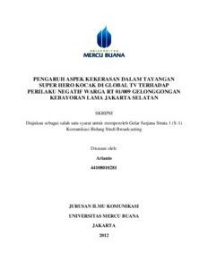 ARIANTO, ARIANTO (2012) PENGARUH ASPEK KEKERASAN DALAM TAYANGAN SUPER HERO KOCAK DI GLOBAL TV TERHADAP PERILAKU NEGATIF WARGA RT 01/009 GELONGGONGAN KEBAYORAN LAMA JAKARTA SELATAN. S1 thesis, Universitas Mercu Buana Jakarta.