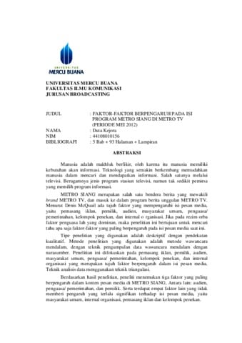 KEJORA, DUTA (2012) FAKTOR - FAKTOR BERPENGARUH PADA ISI PROGRAM METRO SIANG DI METRO TV (Periode Mei 2012). S1 thesis, Universitas Mercu Buana Jakarta.