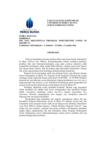 Televisi memainkan peranan penting dalam menyerap bentuk dokumenter di tahun 1970-an dan 1980-an. Keanekaragaman bentuk membuat pembuatpembuat film dari kelompok-kelompok yang pada awalnya minoritas telah mengambil kesempatan untuk tampil lebih istimewa, dengan suara-suara khusus dan tujuan-tujuan tertentu. Hal ini penting bagi keberadaan dokumenter sebagai alat sosial yang penting untuk kelanjutan prinsip-prinsip demokratis. Program Inside merupakan salah satu program berita yang dikemas dengan format dokumenter di Metro TV. Program Inside berdurasi 30 menit dan tayang seminggu sekali setiap hari Kamis pada pukul 23.00 WIB – 23.30 WIB. Karakter program ini yaitu dikemas secara dokumenter dengan pendekatan true story movie tanpa presenter dan minimize script. Penelitian ini bertujuan untuk mengetahui dan memahami Ide dan Kreatifitas Program Dokumenter Inside di Metro TV. Penelitian dilakukan secara deskriptif kualitatif. Metode yang digunakan dalam penelitian ini adalah studi kasus menggunakan tipe penelitian dengan teknik wawancara mendalam (depth interview) kepada narasumber (key informan). Prosedur pengumpulan data dengan cara melakukan observasi langsung dan wawancara mendalam. Berdasarkan hasil penelitian dan analisis, menunjukan bahwa Ide dan Kreatifitas Program Dokumenter Inside di Merto TV ditinjau secara teori dan mekanisme kerja program Inside telah sesuai dengan teori produksi dokumenter versi Fred Wibowo dalam bukunya “Teknik Produksi Program Televisi” yang terdiri dari pra produksi, produksi dan paska produksi. Kesimpulan penelitian adalah bahwa implementasi Ide dan Kreatifitas dalam Program Dokumenter Inside berlangsung secara berkesinambungan selama proses produksi dari pra produksi hingga paska produksi.