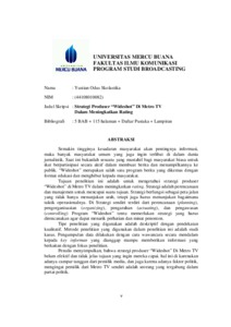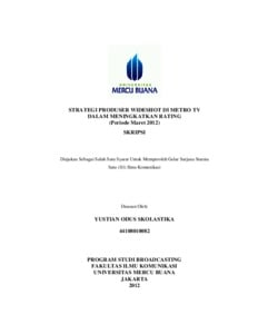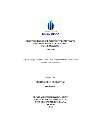 SKOLASTIKA, YUSTIAN ODUS (2012) STRATEGI PRODUSER WIDESHOT DI METRO TV DALAM MENINGKATKAN RATING (Periode Maret 2012). S1 thesis, Universitas Mercu Buana Jakarta.