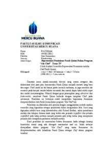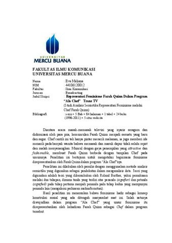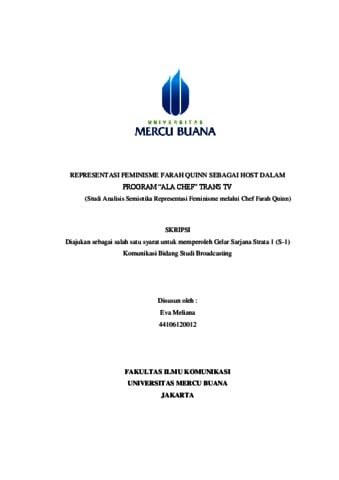 MELIANA, EVA (2012) REPRESENTASI FEMINISME FARAH QUINN SEBAGAI HOST DALAM PROGRAM “ALA CHEF” TRANS TV (Studi Analisis Semiotika Representasi Feminisme melalui Chef Farah Quinn). S1 thesis, Universitas Mercu Buana Jakarta.