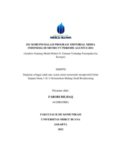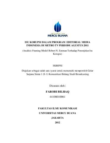 BILHAQ, FAROBI (2012) ISU KORUPSI DALAM PROGRAM EDITORIAL MEDIA INDONESIA DI METRO TV PERIODE AGUSTUS 2011 (Analisis Framing Model Robert N. Entman Terhadap Penonjolan Isu Korupsi). S1 thesis, Universitas Mercu Buana Jakarta.
