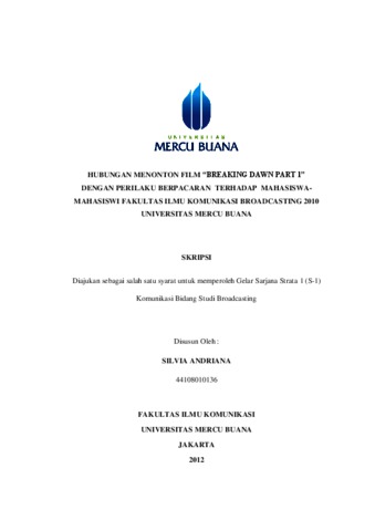 ANDRIANA, SILVIA (2012) HUBUNGAN MENONTON FILM “BREAKING DAWN PART 1” DENGAN PERILAKU BERPACARAN TERHADAP MAHASISWA MAHASISWI FAKULTAS ILMU KOMUNIKASI BROADCASTING 2010 UNIVERSITAS MERCU BUANA. S1 thesis, Universitas Mercu Buana Jakarta.