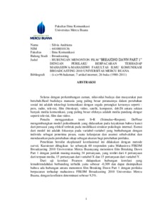 Selaras dengan perkembangan zaman, nilai-nilai budaya dan masyarakat pun berubah.Hasil budidaya manusia yang paling besar peranannya dalam perubahan sosial ini adalah teknologi komunikasi dengan segala perangkat kerasnya seperti : pers, radio, televisi, film (bioskop), video, satelit, komputer, dsb.Di antara sekian banyak media komunikasi, yang paling besar efeknya adalah media pandang-dengar seperti televisi, film dan video. Penulis menggunakan teori S–R (Stimulus–Respon). DeFleur mengembangkan model psikodinamik yang didasarkan pada keyakinan bahwa kunci dari persuasi yang efektif terletak pada modifikasi struktur psikologis internal. Esensi dari model ini adalah fokusnya pada variabel-variabel yang berhubungan dengan individu sebagai penerima pesan, suatu kelanjutan dan asumsi sebab-akibat dan mendasarkan pada perubahan sikap sebagai ukuran bagi perubahan perilaku. Penelitian bersifat eksplanatif korelasional ini dilakukan dengan metode survei. Kuesioner dibagikan ke sebanyak 60 responden yaitu Mahasiswa FIKOM Broadcasting 2010 Unviversitas Mercu Buanayang menonton film Breaking Dawn Part 1 dengan jumlah masing-masing 34 pertanyaan, yang terdiri dari 4 pertanyaan dari terpaan media, 15 pertanyaan dari variabel X dan 15 pertanyaan dari variabel Y. Dari uji korelasi Pearson didapatkan hubungan korelasi yang lemah/rendahdan berbanding terbalik yaitu sebesar -0,309 dan dapat disimpulkan bahwa ada hubungan antara menonton film Breaking Dawn Part 1 dengan perilaku berpacaran terhadap mahasiswa FIKOM Broadcasting 2010 Universitas Mercu Buana, dengan koefisien determinasi sebesar 9,5%.
