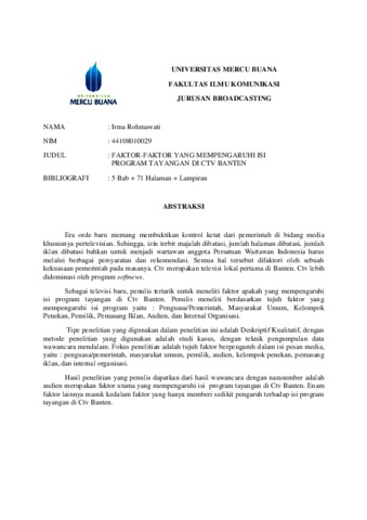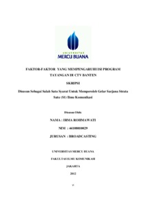 ROHMAWATI, IRMA (2012) FAKTOR-FAKTOR YANG MEMPENGARUHI ISI PROGRAM TAYANGAN DI CTV BANTEN. S1 thesis, Universitas Mercu Buana Jakarta.