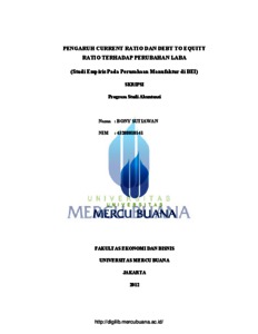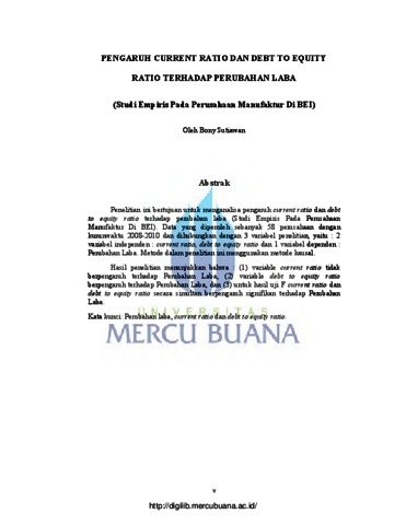 SUTIAWAN, BONY (2012) PENGARUH CURRENT RATIO DAN DEBT TO EQUITY RATIO TERHADAP PERUBAHAN LABA (Studi Empiris Pada Perusahaan Manufaktur di BEI). S1 thesis, Universitas Mercu Buana Jakarta.