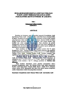 Penelitian ini bertujuan untuk mengetahui pengaruh Kompleksitas Audit dan Tekanan Waktu Audit terhadap Kualitas Audit Pada Kantor Akuntan Publik di Jakarta. Penelitian ini menggunakan metode penelitian asosiatif kausal. Sampel yang digunakan dalam penelitian adalah 12 Kantor Akuntan Publik di Jakarta dengan jumlah quesioner sebanyak 75 eksemplar. Dari jumlah tersebut yang kembali dan val;id sebanyak 54 eksemplar. Pada penelitian ini penulis menggunakan program SPSS versi 15.00 sebagai alat bantu dalam melakukan uji normalitas data, uji asumsi klasik, deskriptif statistik, analisis regresi, uji hipotesis dan koefisien determinasi dengan taraf nyata 5 % ( 0,05). Hasil penelitian ini dari dari uji signifikan parsial (Uji T) antara Kompleksitas Audit Terhadap Kualitas Audit terdapat pengaruh yang signifikan dengan didapatkan uji statistiknya thitung = 3,570 > ttabel (0,025 ; 54) = 2,005, sedangkan Tekanan Waktu Audit Terhadap Kualitas Audit terdapat pengaruh yang signifikan dengan didapatkan uji statistiknya thitung =2,493 > ttabel (0,025 ; 54) = 2,005. Sementara untuk uji signifikan simultan ( Uji F ) antara Kompleksitas Audit dan Tekanan Waktu Audit Terhadap Kualitas Audit didapatkan uji statistiknya Fhitung = 41,214 > Ftabel (0,05; 3;52) = 2,001 artinya ada pengaruh yang signifikan secara simultan ( Uji F ) sehingga penelitian ini diterima atau didukung. Hasil koefisien determinasi secara simultan menunjukkan bahwa kontribusi Kompleksitas Audit dan Tekanan Waktu Audit dalam menjelaskan Kualitas Audit Pada Kantor Akuntan Publik Jakarta adalah 10,1% sedangkan sisanya sebesar 89,9% dipengaruhi oleh faktor lain seperti batasan kompetensi auditor, Independensi Auditor dan pengetahuan akuntansi. Kata kunci : Kompleksitas Audit. Tekanan Waktu Audit dan Kualitas Audit