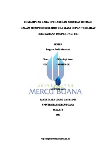 ASTUTI, WITTA PUJI (2012) KEMAMPUAN LABA OPERASI DAN ARUS KAS OPERASI DALAM MEMPREDIKSI ARUS KAS MASA DEPAN TERHADAP PERUSAHAAN PROPERTY DI BEI. S1 thesis, Universitas Mercu Buana Jakarta.