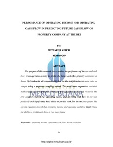 The purpose of this research is to examine the perfomance of income and cash flow from operating activity to predict the future cash flow property companies at Bursa Efek Indonesia. 40 companies listed in the Bursa Efek Indonesia were taken as sample using a purposive sampling method. The multi linear regression statistical method used to test hypotheses. There are two equations used in this research. The first equation showed that operating income and operating cash flow in the year positively and significantly have ability to predict cash flow in one year future. The second equation showed that operating income and operating cashflow doesn’t have the ability to predict cash flow in two years future Keywords : operating income, operating cash flow, future cash flow.