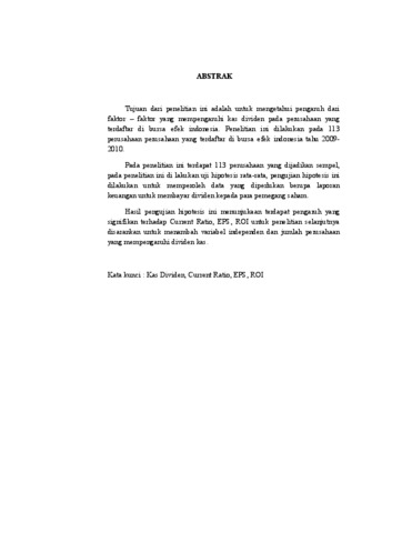 Tujuan dari penelitian ini adalah untuk mengetahui pengaruh dari faktor – faktor yang mempengaruhi kas dividen pada perusahaan yang terdaftar di bursa efek indonesia. Penelitian ini dilakukan pada 113 perusahaan perusahaan yang terdaftar di bursa efek indonesia tahu 2009- 2010. Pada penelitian ini terdapat 113 perusahaan yang dijadikan sempel, pada penelitian ini di lakukan uji hipotesis rata-rata, pengujian hipotesis ini dilakukan untuk memperoleh data yang diperlukan berupa laporan keuangan untuk membayar dividen kepada para pemegang saham. Hasil pengujian hipotesis ini menunjukaan terdapat pengaruh yang signifikan terhadap Current Ratio, EPS, ROI untuk penelitian selanjutnya disarankan untuk menambah variabel independen dan jumlah perusahaan yang mempengaruhi dividen kas.