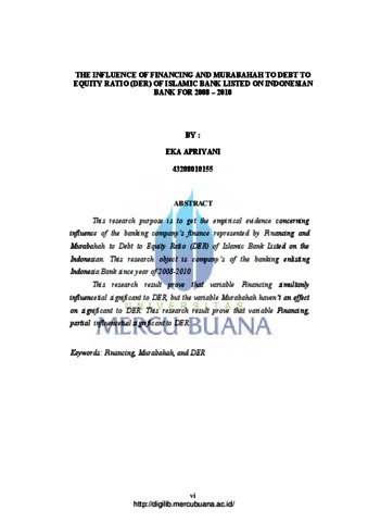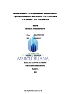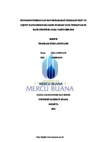 APRIYANI, EKA (2012) PENGARUH PEMBIAYAAN DAN MURABAHAH TERHADAP DEBT TO EQUITY RATIO PADA BANK SYARIAH YANG TERDAFTAR DI BANK INDONESIA TAHUN 2008-2010. S1 thesis, Universitas Mercu Buana Jakarta.