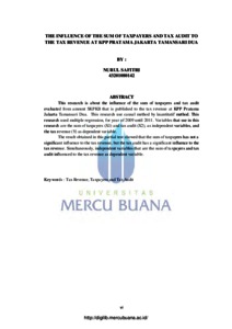 SAFITRI, NURUL (2012) PENGARUH JUMLAH WAJIB PAJAK DAN PEMERIKSAAN PAJAK TERHADAP PENERIMAAN PAJAK PENGHASILAN PADA KANTOR PELAYANAN PAJAK PRATAMA JAKARTA TAMANSARI DUA. S1 thesis, Universitas Mercu Buana Jakarta.