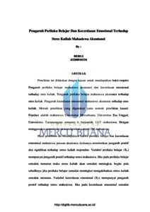 Penelitian ini dilakukan dengan tujuan untuk mendapatkan bukti empiris Pengaruh perilaku belajar mahasiswa akuntansi dan kecerdasan emosional terhadap stres kuliah. Pengaruh perilaku belajar mahasiswa akuntansi terhadap stres kuliah. Pengaruh kecerdasan emosional mahasiswa akuntansi terhadap stres kuliah. Metode penelitian yang digunakan yaitu metode penelitian kausal. Populasi adalah mahasiswa Universitas Mercubuana, Universitas Esa Unggul, Univerisitas Tarumanegara semester 6 berjumlah 1115 mahasiswa. Dengan menggunakan metode slovin mendapatkan sampel 294 mahasiswa. Hasil penelitian ini menunjukkan bahwa perilaku belajar dan kecerdasan emosional mahasiswa jurusan akuntansi, keduanya memberikan pengaruh positif dan signifikan terhadap stress kuliah responden. Variabel perilaku belajar (X1) mempunyai pengaruh positif terhadap stress mahasiswa. Jika pada perilaku belajar semakin menurun maka stress kuliah akan semakin meningkat, begitu pula sebaliknya jika perilaku belajar semakin meningkat mengakibatkan stress kuliah semakin menurun. Variabel kecerdasan emosional (X2) mempunyai pengaruh positif terhadap stress mahasiswa. Jika pada kecerdasan emosional semakin menurun maka stress kuliah akan semakin meningkat, begitu pula sebaliknya jika kecerdasan emosional semakin meningkat mengakibatkan stress kuliah semakin menurun. Kata kunci : perilaku belajar, kecerdasan emosional, stress kuliah