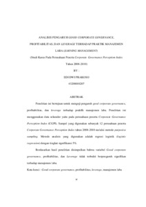 PRAKOSO, EDI DWI (2012) ANALISIS PENGARUH MEKANISME GOOD CORPORATE GOVERNANCE, PROFITABILITAS DAN LEVERAGE TERHADAP PRAKTIK MANAJEMEN LABA (EARNING MANAGEMENT) (Studi Kasus Pada Perusahaan Peserta Corporate Governance Perception Index Tahun 2008-2010). S1 thesis, Universitas Mercu Buana Jakarta.