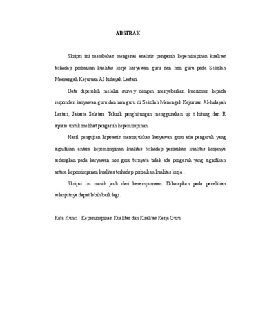 Skripsi ini membahas mengenai analisis pengaruh kepemimpinan kualitas terhadap perbaikan kualitas kerja karyawan guru dan non guru pada Sekolah Meenengah Kejuruan Al-hidayah Lestari. Data diperoleh melalui survey dengan menyebarkan kuesioner kepada responden karyawan guru dan non guru di Sekolah Menengah Kejuruan Al-hidayah Lestari, Jakarta Selatan. Teknik penghitungan menggunakan uji t hitung dan R square untuk melihat pengaruh kepemimpinan. Hasil pengujian hipotesis menunjukkan karyawan guru ada pengaruh yang signifikan antara kepemimpinan kualitas terhadap perbaikan kualitas kerjanya sedangkan pada karyawan non guru ternyata tidak ada pengaruh yang signifikan antara kepemimpinan kualitas terhadap perbaikan kualitas kerja . Skripsi ini masih jauh dari kesempurnaan. Diharapkan pada penelitian selanjutnya dapat lebih baik lagi.