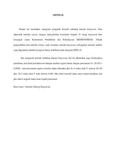 Skripsi ini membahas mengenai pengaruh insentif terhadap kinerja karyawan. Data diperoleh melalui survey dengan menyebarkan kuesioner kepada 35 orang karyawan biro keuangan setjen Kementrian Pendidikan dan Kebudayaan (KEMENDIBUD). Teknik pengambilan data melalui sensus, yaitu mendata seluruh karyawan, sedangakan metode analisis yang digunakan adalah uji regersi linear sederhana pada program SPSS 18. Ada pengaruh insentif terhadap kinerja karyawan, hal ini dibuktikan juga berdasarkan penelitian, dari hasil penelitian ini didapat analisis regresi linear dengan persamaan Y= 20.185 + 0,469X , dari persamaan regresi tersebut dapat diketahui jika X= 0 maka niali Y sebesar 20.185 jika, X=1 maka nilai Y naik sebesar 0,469. Jika nilai b positif maka akan terjadi kenaikan, dan jika nilai b negatif maka akan terjadi penurunan.