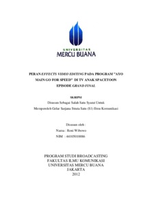 WIBOWO, RONI (2012) PERAN EFFECTS VIDEO EDITING PADA PROGRAM ”AYO MAIN GO FOR SPEED” DI TV ANAK SPACETOON EPISODE GRAND FINAL. S1 thesis, Universitas Mercu Buana Jakarta.