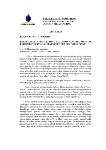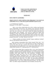 Effects video editing adalah fasilitas dari software editing yang digunakan untuk memperindah (Entertainment) dan membuat kesan pada hasil editannya (Dramatic-News). Effects video editing dibagi ke dalam dua kelompok yaitu video effects dan video transitions. Video effects adalah efek editing yang diletakkan pada potongan video, sedangkan video transitions adalah efek editing yang diletakkan di antara dua potongan video. Masing-masing Effects video editing yang diberikan pada gambar akan memberikan makna tersendiri pada gambar. Penelitian ini bertujuan untuk mengetahui makna penggunaan effects video editing program Game show “Ayo Main” episode Grand Final. Adapun penelitian ini bersifat deskriptif dengan pendekatan kualitatif. Metode yang digunakan adalah studi kasus. Hasil penelitian menunjukkan bahwa dalam program Game show “Ayo Main” Episode Grand Final di TV Anak Spacetoon ini, editor menggunakan 4 macam video effects dan juga 4 macam video transitions. Effects video editing yang digunakan tersebut adalah Effects video editing yang tersedia dalam software editing Adobe Premiere CS 3 yang digunakan di TV Anak Spacetoon. Disini peneliti melihat editor memberikan Effects video editing kepada hasil editingnya, salah satunya adalah memperhatikan unsur keindahan, seni dan filling. Meskipun keindahan bersifat subjektif, keindahan yang coba dihasilkan adalah keindahan untuk dapat dilihat oleh mata pemirsanya. Keindahan untuk mempercantik gambar dari frame satu ke frame berikutnya sehingga enak dipandang dan ditonton. Penggunaan effects video editing ini juga dilakukan untuk menghindari kebosanan ketika pemirsa harus melihat banyak framing yang sama dalam program game show ”Ayo Main” dan juga untuk memperbaiki ketidaksesuaian antara gambar dengan rundown program. Pertimbangan dalam penggunaan Effects video editing adalah berdasarkan ideology dari editor Game Show “Ayo Main” dengan memperhatikan unsur keindahan, seni dan filling.