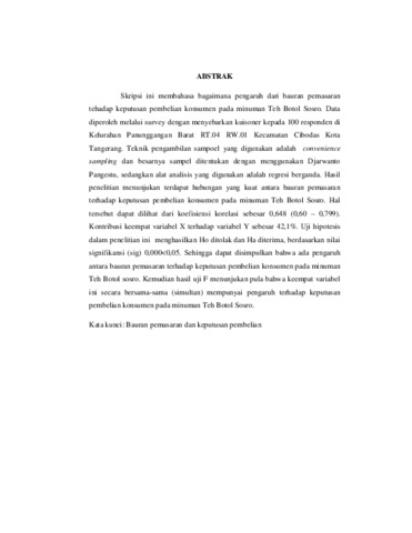 Skripsi ini membahasa bagaimana pengaruh dari bauran pemasaran tehadap keputusan pembelian konsumen pada minuman Teh Botol Sosro. Data diperoleh melalui survey dengan menyebarkan kuisoner kepada 100 responden di Kelurahan Panunggangan Barat RT.04 RW.01 Kecamatan Cibodas Kota Tangerang. Teknik pengambilan sampoel yang digunakan adalah convenience sampling dan besarnya sampel ditentukan dengan menggunakan Djarwanto Pangestu, sedangkan alat analisis yang digunakan adalah regresi berganda. Hasil penelitian menunjukan terdapat hubungan yang kuat antara bauran pemasaran terhadap keputusan pembelian konsumen pada minuman Teh Botol Sosro. Hal tersebut dapat dilihat dari koefisiensi korelasi sebesar 0,648 (0,60 – 0,799). Kontribusi keempat variabel X terhadap variabel Y sebesar 42,1%. Uji hipotesis dalam penelitian ini menghasilkan Ho ditolak dan Ha diterima, berdasarkan nilai signifikansi (sig) 0,000<0,05. Sehingga dapat disimpulkan bahwa ada pengaruh antara bauran pemasaran terhadap keputusan pembelian konsumen pada minuman Teh Botol sosro. Kemudian hasil uji F menunjukan pula bahwa keempat variabel ini secara bersama-sama (simultan) mempunyai pengaruh terhadap keputusan pembelian konsumen pada minuman Teh Botol Sosro.