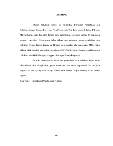 Dalam penulisan skripsi ini membahas hubungan Pendidikan dan Pelatihan dengan Kinerja Karyawan Non Dosen pada Unit Tata Usaha di Setiap Fakultas Mercu Buana. Data diperoleh dengan cara memberikan kuesioner kepada 40 karyawan sebagai responden. Hipotesisnya ialah diduga ada hubungan antara pendidikan dan pelatihan dengan kinerja karyawan. Dengan menggunakan alat uji analisis SPSS maka didapat nilai Korelasi atau hubungan sebesar 0,669. Hal ini berarti bahwa pendidikan dan pelatihan memiliki hubungan yang positif dengan kinerja karyawan. Penulis menyarankan sebaiknya pendidikan dan pelatihan harus terus diperbaharui dan ditingkatkan, guna memenuhi kebutuhan organisasi dan harapan pegawai di masa yang akan datang, karena telah terbukti dapat meningkatkan kinerja pegawai.