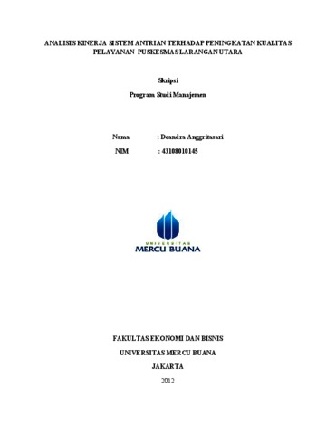 ANGGRITASARI, DEANDRA (2012) ANALISIS KINERJA SISTEM ANTRIAN TERHADAP PENINGKATAN KUALITAS PELAYANAN PUSKESMAS LARANGAN UTARA. S1 thesis, Universitas Mercu Buana Jakarta.