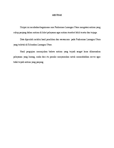 Skripsi ini membahas bagaimana cara Puskesmas Larangan Utara mengatasi antrian yang cukup panjang dalam antrian di loket pelayanan agar antrian tersebut lebih teratur dan terjaga. Data diperoleh melalui hasil penelitian dan wawancara pada Puskesmas Larangan Utara yang terletak di Kelurahan Larangan Utara . Hasil pengujian menunjukan bahwa antrian yang terjadi sangat lama dikarenakan pelayanan yang kurang, maka dari itu penulis menyarankan untuk menambahkan server agar tidak terjadi antrian yang panjang.