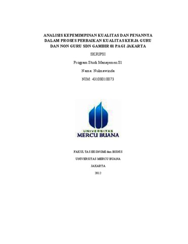 NULMAWINDA, NULMAWINDA (2012) ANALISIS KEPEMIMPINAN KUALITAS DAN PENANNYA DALAM PROSES PERBAIKAN KUALITAS KERJA GURU DAN NON GURU SDN GAMBIR 01 PAGI JAKARTA. S1 thesis, Universitas Mercu Buana Jakarta.