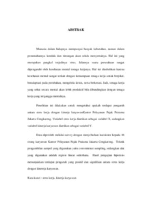 Manusia dalam hidupnya mempunyai banyak kebutuhan, namun dalam pemenuhannya kendala dan rintangan akan selalu menyertainya. Hal ini yang merupakan pangkal terjadinya stres. Jalannya suatu perusahaan sangat dipengaruhi oleh kesehatan mental tenaga kerjanya. Hal ini disebabkan karena kesehatan mental sangat terkait dengan kemampuan tenaga kerja untuk berpikir, beradaptasi pada perubahan, mengelola krisis, serta berkreasi. Jadi, tenaga kerja yang sehat secara mental akan lebih produktif bila dibandingkan dengan tenaga kerja yang terganggu mentalnya. Penelitian ini dilakukan untuk mengetahui apakah terdapat pengaruh antara stres kerja dengan kinerja karyawanKantor Pelayanan Pajak Pratama Jakarta Cengkareng. Variabel stres kerja diartikan sebagai variabel X, sedangkan variabel kinerja karyawan diartikan sebagai variabel Y. Data diperoleh melalui survey dengan menyebarkan kuesioner kepada 46 orang karyawan Kantor Pelayanan Pajak Pratama Jakarta Cengkareng. Teknik pengambilan sampel yang digunakan yaitu convenience sampling, sedangkan alat yang digunakan adalah regresi linear sederhana. Hasil pengujian hipotesis menunjukkan terdapat pengaruh yang positif dan signifikan antara stres kerja dengan kinereja karyawan.